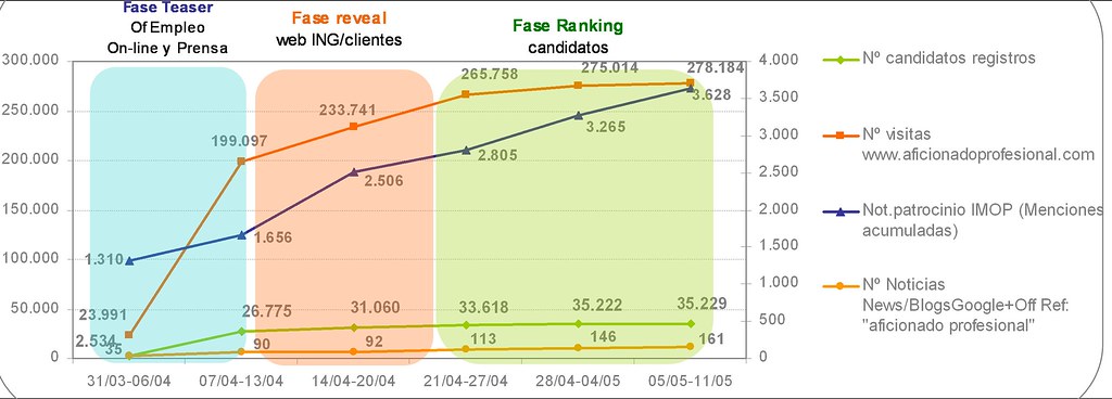 En este gráfico se sintetizan diferentes indicadores del éxito de la campaña y se puede observar la gran expectación despertada en la fase de oferta de empleo, que produjo fuertes incrementos en indicadores como la notoriedad de la marca como patrocinador, las visitas a la web, los registros o las noticias aparecidas en los medios. A partir de esta fase, se inicia una fase de una semana donde se comunica la campaña a los clientes de ING Direct para posteriormente, del 21 de Abril al 11 de Mayo, hacer comunicación pública y proceder a al selección del candidato. En estas dos últimas fases el interés de la campaña sigue manteniéndose vivo y los indicadores siguen creciendo auqneu más lentamente.