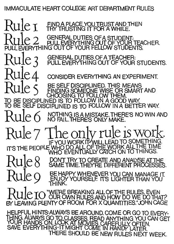 Si Werner Herzog ha escrito, sin quererlo, el mejor manual de emprendimiento que podíamos imaginar, el compositor John Cage popularizó uno de las mejores, y más breves, guías para una educación realmente significativa. En realidad fue la hermana Corita Kent quien elaboró las 10 reglas para estudiantes y maestros en 1968 para un proyecto que desarrollaba en sus clases y Cage los popularizo. Estas reglas se han publicado en diversos lugares como en Open Culture (10 Rules for Students and Teachers Popularized by John Cage):