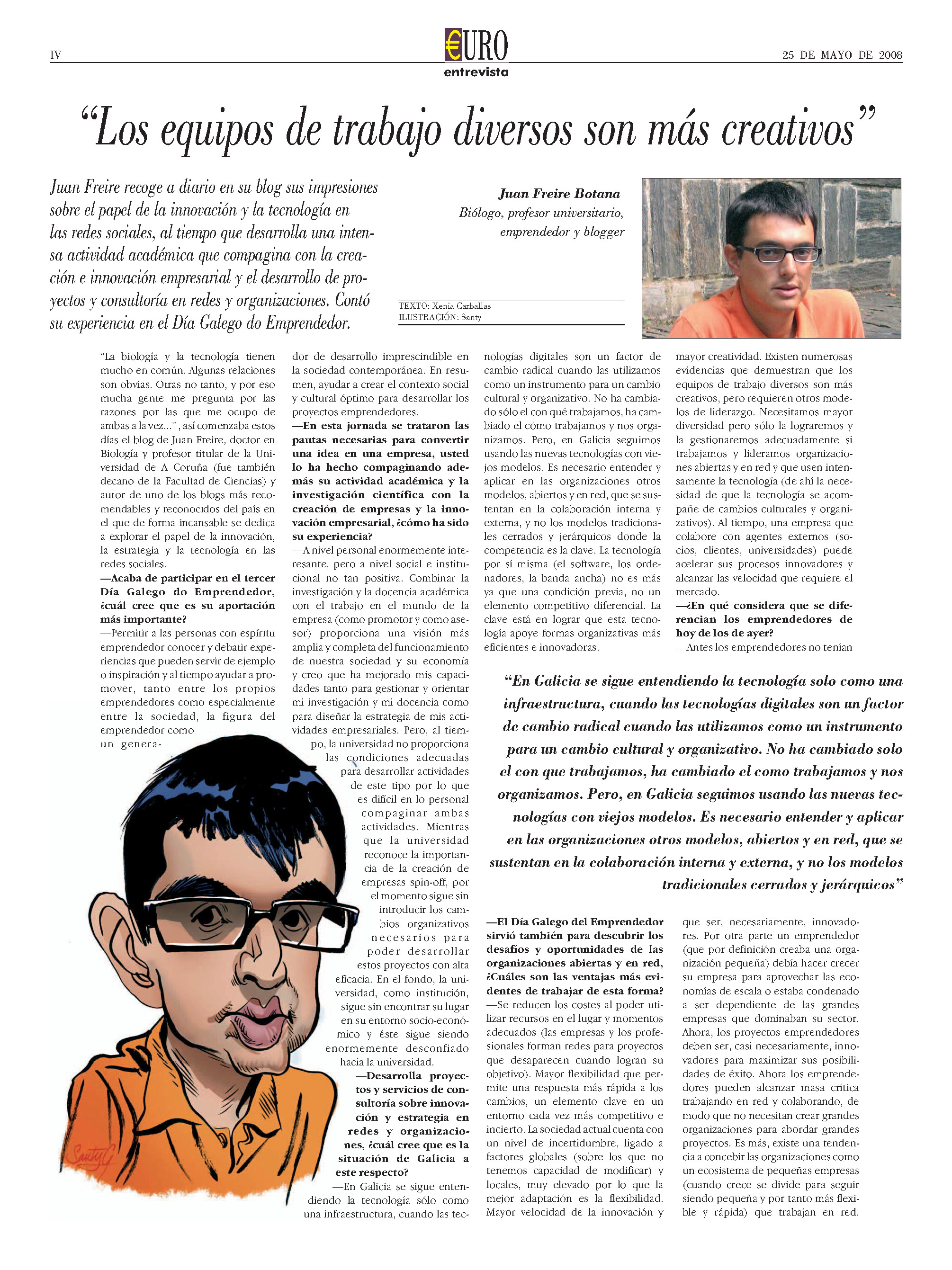 El pasado domingo 25 Mayo publicaron en Atlántico Diario una entrevista (pdf) que me había realizado Xenia Carballas por correo electrónico. La entrevista surgió a partir de mi participación en el Día do Emprendedor de Santiago de Compostela y discurre por los temas que ya presenté allí, además de mi experiencia y la situación en Galicia. Para la introducción han utilizado la analogía entre biología y tencología con que empezaba Tecnología “chapucera” (que retoma y amplía Antonio P. Cribeiro en su nuevo blog).
