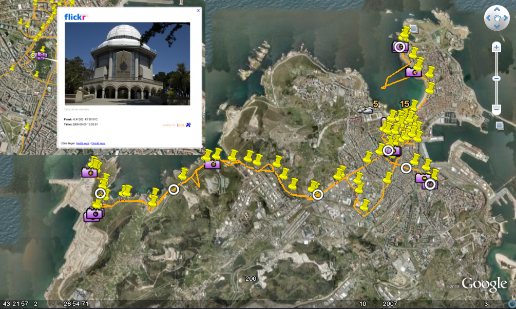 Ipoki Life Stream es el último servicio lanzado por Ipoki y realiza una integración cartográfica de sus otras aplicaciones y mashups. El Life Stream de un usuario no es más que un archivo KML, el formato de Google Earth, que incluye la ruta que el usuario registra en Ipoki y adjunta referencias a la informacion en Internet que esa persona ha producido y recibido durante ese periodo. Cualquier información de sistemas externos podrá ser geolocalizada por Ipoki “al vuelo” si tienen una API publica que permita buscar por fechas. Por el momento solo integra los comentarios que se publican directamente en Ipoki y las fotografías de Flickr (pero en breve llegarán otros servicios externos, como Twitter y posiblemente Qik). Este es un ejemplo del KML que se obtiene (correspondiente a una ruta por el centro de A Coruña); la imagen es una captura de pantalla de Google Earth con la ruta y una vista de una de las fotografías incluidas.