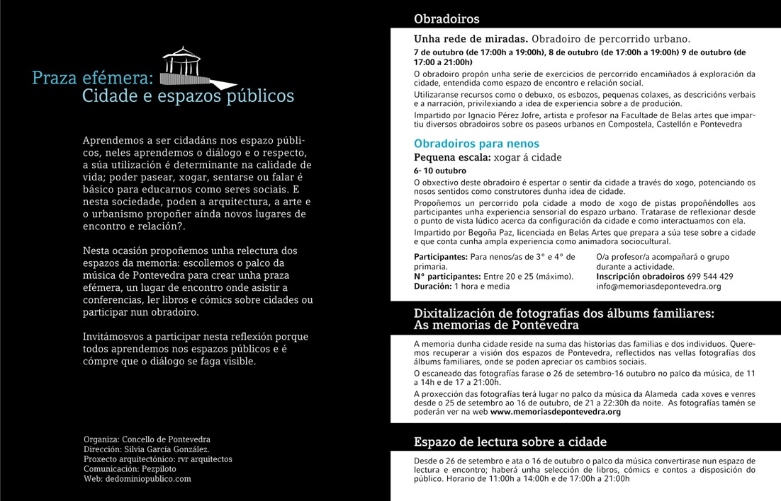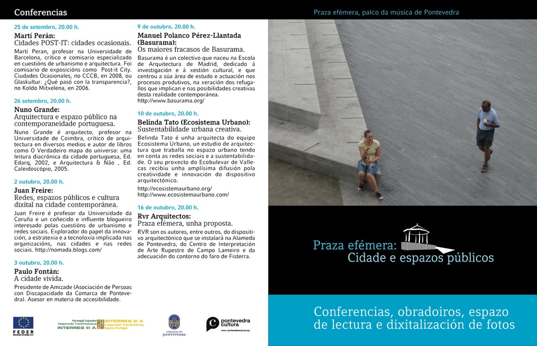 Pontevedra Cultura, el área municipal de cultura del Ayuntamiento de Pontevedra, organiza Praza efémera: Cidade e espazos públicos, una propuesta de intervención y diálogo sobre los espacios urbanos y de recuperación de la memoria de la ciudad (que se puede seguir en su galería de imágenes) que dirige Silvia García González, de la Facultad de Bellas Artes de la Universidad de Vigo en Pontevedra.